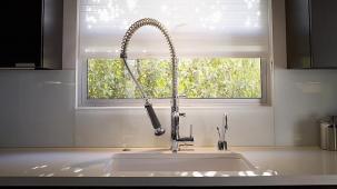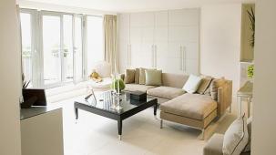 This apartment with nice shades of blue and a beautiful bathroom will help you to relax after work.